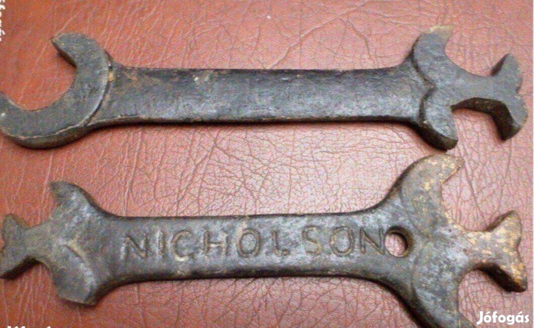 Eladó egyben 2 db antik kovácsoltvas villás kulcs az 1800-as évekből .Nicholson - Gépgyár Budapest terméke. Méret: 22 cm hosszú