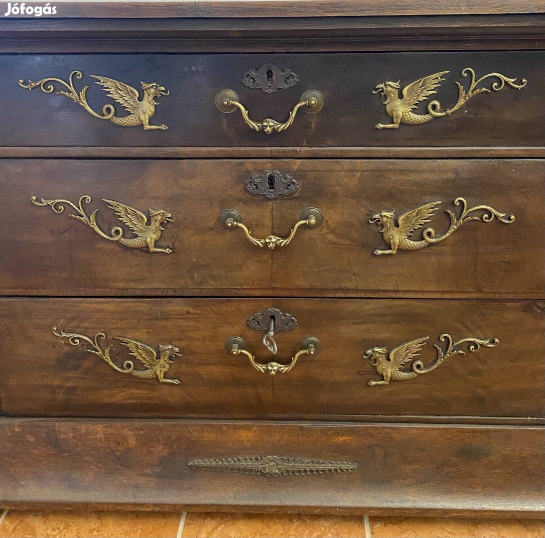 Barokk stílusú 3 fiókos komód. Rézveretekkel és fogantyúkkal, valamint réz sarkányokkal. 117 cm hosszú, 52 cm széles, 83 cm magas.