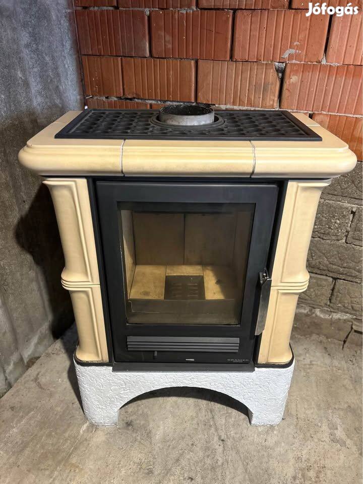 Oranier Justus - Bavaria tipusú hordozható cserépkályha , krém színű kerámia cserép burkolattal . Fa tárolós talpazattal .
