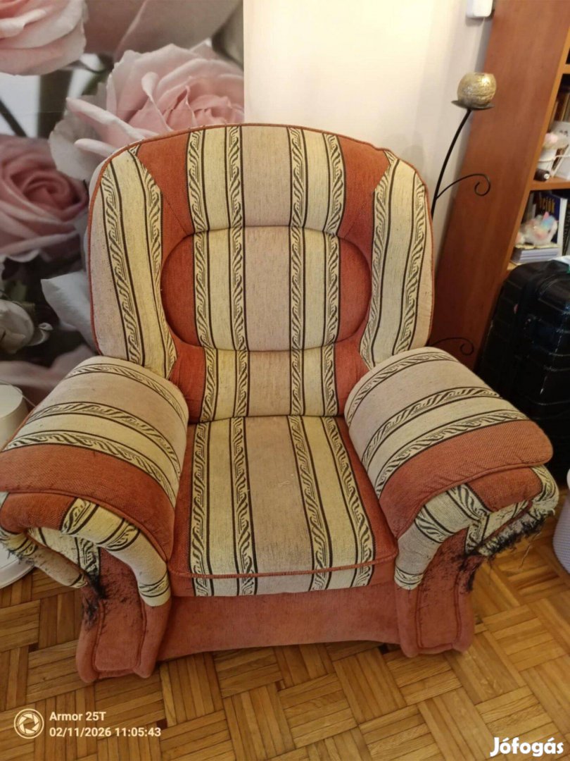 Eladó egy ülőgarnitúra szett 3-2-1 es összeállítás egyben ,ággyá alakítható ,és ágyneműtartós kivitel .Ahogy a képeken látszik át kell kárpitozni,szerkezetileg stabil bonell rugós nincs kiülve egyik darab sem.