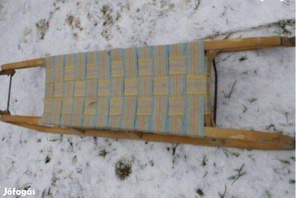 Eladó retro nagy méretű 2 személyes fonott gurtnis ülőkés fa szánkó pár helyen a fa váz sérülésével. méret:145 cm hosszú