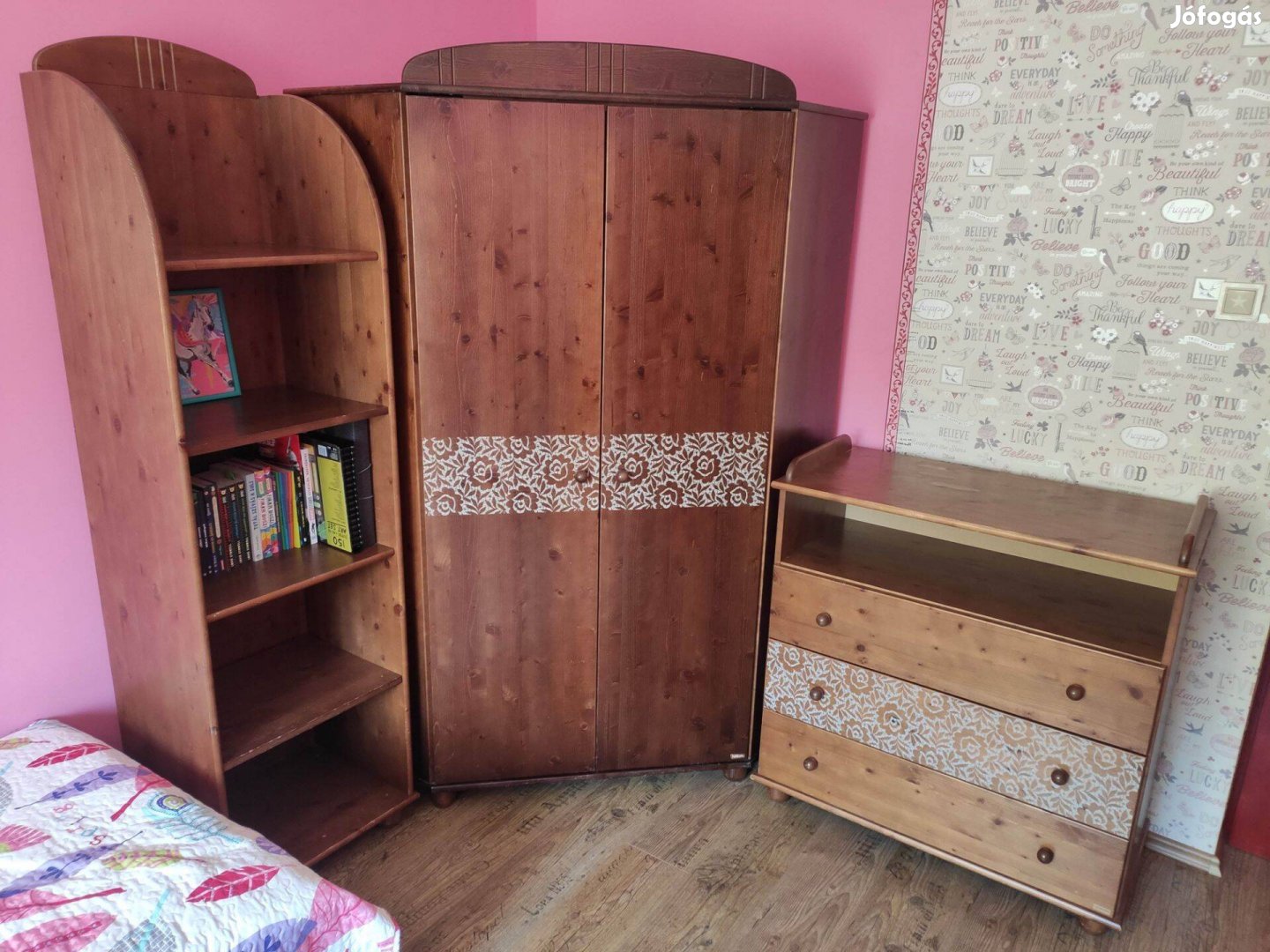 Faktum Tomi fenyő komplett gyerekszoba bútor szett formájában is eladó (külön hirdetésben is szerepel), melynek részei: Sarok ruhásszekrény, 3 részes polcos és akasztós nagy szekrény, polcos szekrény, 70x140 méretű rácsos kiságy - ifjúsági ágynak átalakítható (állítható fekvő-magassággal), pelenkázó komód (átalakítható), polcos éjjeliszekrény, teleszkópos felnyitható kincses láda.