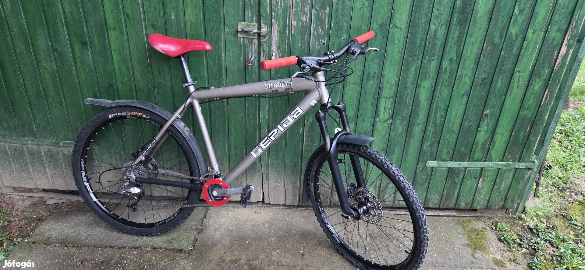 Gepida Sirmium 26" könnyű, alu vázas mountainbike-om eladó 51,5 cm vázmérettel. Felső cső hossza: 60 cm, atlépő magasság: 85 cm. Shimano Deore LX hajtókarok, Deore első váltó, LX hátsó váltó, 2x9 sebesség. Shimano Alivio Fékváltókarok hidraulikus tárcsafékekkel. Suntour Xcr teleszkóp 120 mm rugóúttal, dupla falú, szegecselt felnik, vastag kormány. A bringa most kapott új markolatokat és előre egy 180 mm-es tárcsát. Minden szépen teszina dolgát, azonnal hadra fogható. Festékhibák előfordulnak, a gumik kicsit öregek de a szezont még elfutják.