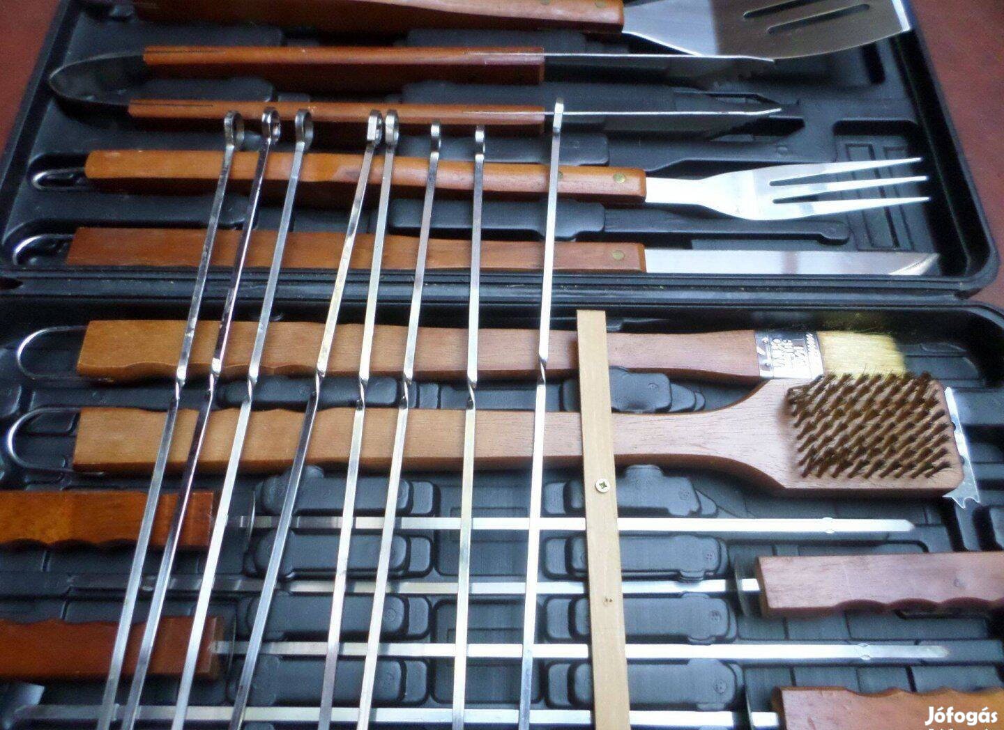 Eladó újszerű állapotú csúcsminőségű grill szett ,grillező készlet hordozható nagy méretű műanyag dobozban-55x30 cm Nemesacél- mahagóni fa nyelű igényes kivitelű. 18 db + 8 db inox nyárs.