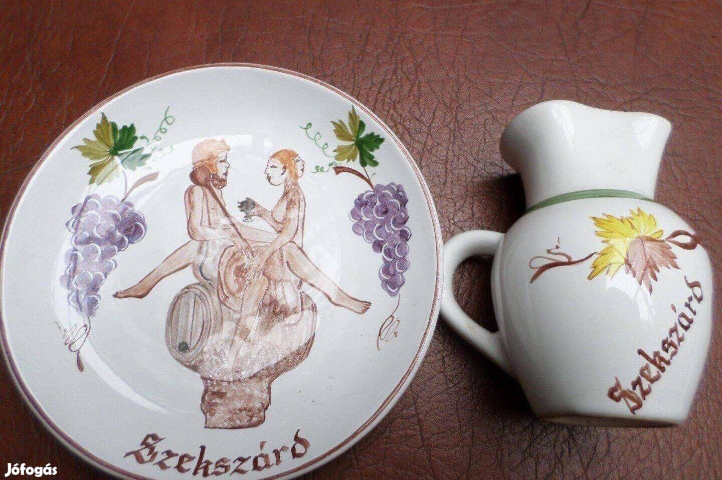 Eladó kerámia boros kancsó tányér. városlődi majolika gyár kézi festésű terméke, új állapot, limitált kiadás. méret: tányér-15 cm átmérő, kancsó 11 cm magas