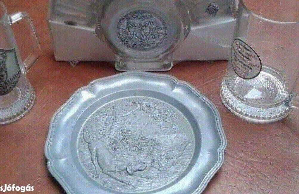 Eladók egyben új vadász korsók, kulacs 6db pohárral-Legjobb vadász felirattal, csengővel és 1 db ón tányér -vadászjelenetes-vizslával, fácánnal áron alul.