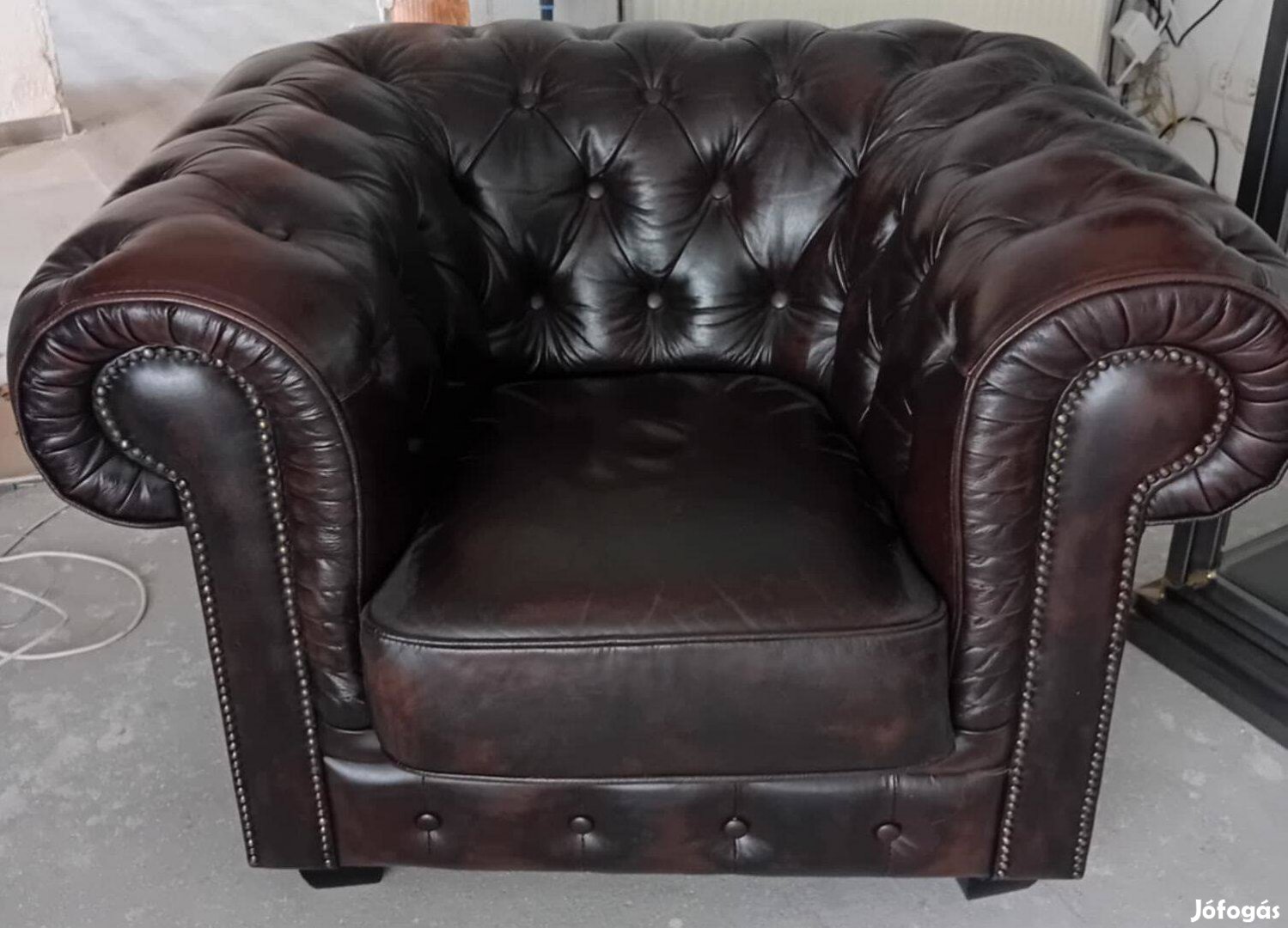 Eladó egy használt de jó állapotban lévő Chesterfield típusú barna színű bőrfotel. Méretei: 75cm magas, 115x90cm.