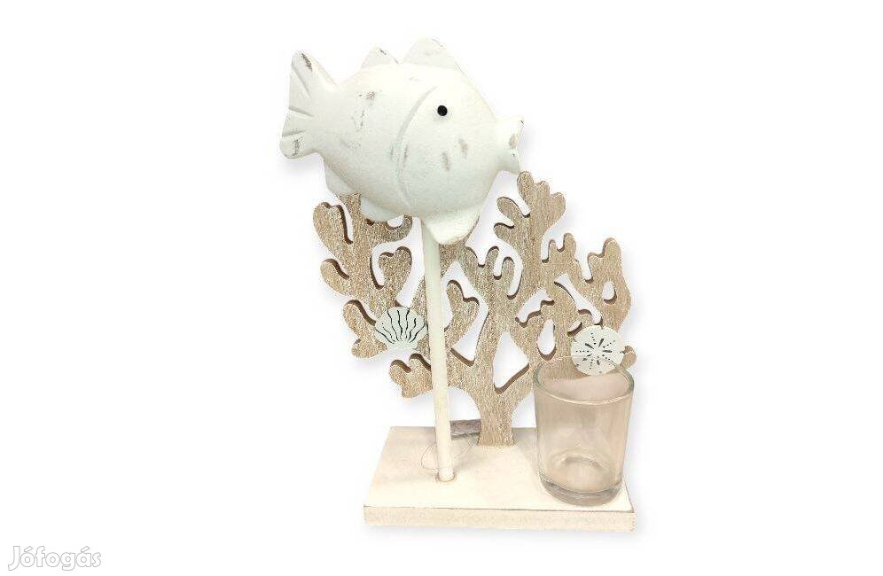 Tartalom: 1 db üveg mécsestartó, korallelem, fa hal forma