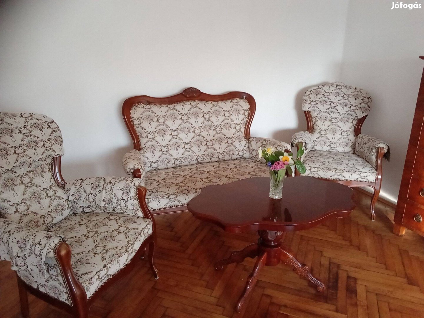 Szép, megkímélt állapotú bútorok, 2000 környékén készültek. Az ülőgarnitúrát faragások díszítik, tartozik hozzá anyagából vart védőhuzat. Az asztal intarziás, lábán faragásokkal.Tetején használatból eredő finom karcolások, polírozással eltűntethetők.