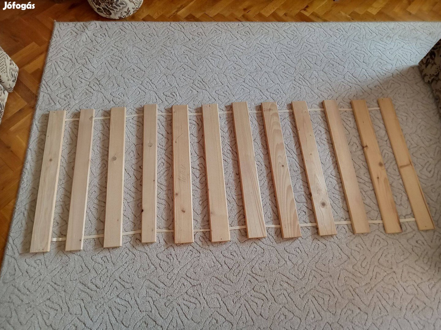 A fotón látható ágyrács eladó. Pontos méret: 78 x 198 cm. Fenyőfa lécekből, 20 milliméter vastag. A lécek egyben vannak, nem repedt, nem deformálódott.