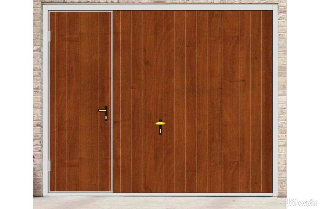 Garázskapu PR 1005 billenő, faerezetű világos mogyoró szín, sok opcióval, bal oldali személybejáróval, T7 11 cm függőleges bordázat, kapumotor, szigetelés, kapukitámasztó, 0Ft szállítás, 0 Ft szerelés bárhová eladó, áfás számlával, új, garanciával.