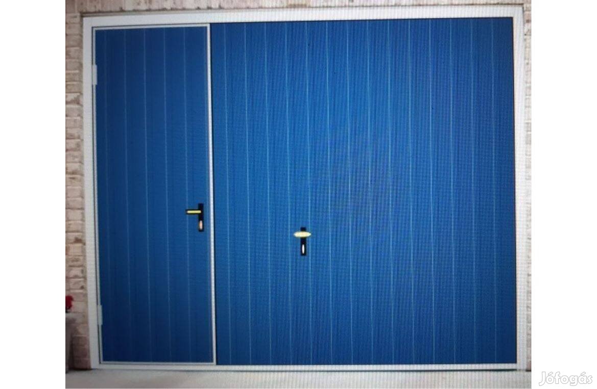 Garázskapu PR billenő, sok opcióval, kék szín fényes felület, személybejáró bal oldalon a kapuban, T7 cm függőleges bordázat, kapumotor, szigetelés, kapukitámasztó, 0Ft szállítás, 0 Ft szerelés bárhová eladó, áfás számlával, új, garanciával.