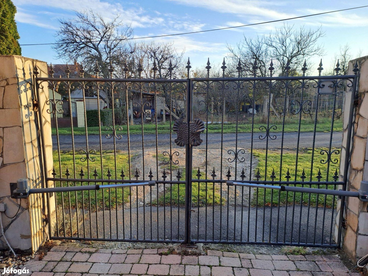 Eladó a képeken látható kétszárnyú kovácsoltvas kapu, teljes mérete: 300x180 cm. Plusz egy személybejáró 90x180 cm. A kapu jó állapotú, de festésre szorul.