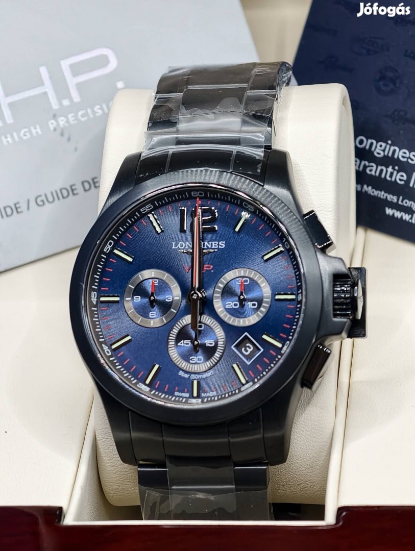 Fekete PVD rozsdamentes acél tok és szíj. Fix fekete PVD rozsdamentes acél lünetta. Kék számlap fekete mutatókkal és arab számos órajelzésekkel. Számlap típusa: Analóg. Világító mutatók és jelzések. Dátumkijelzés 4 és 5 óra között. Kronográf - három segédszámlap: 60 másodperc, 30 perc és 12 óra. L289.2 kaliberű kvarc szerkezet. Karcálló zafírüveg. Csavaros korona. Kerek tokforma, tokméret: 44 mm. Szíjszélesség: 22 mm. Összecsukható csat. 50 méterig / 165 lábig vízálló. Funkciók: kronográf, dátum, óra, perc, másodperc. Conquest Vhp sorozat. Sportóra stílus. Az órát egy nagyon nagy pontosságú (VHP) kvarc szerkezet működteti EOL jelzővel.
