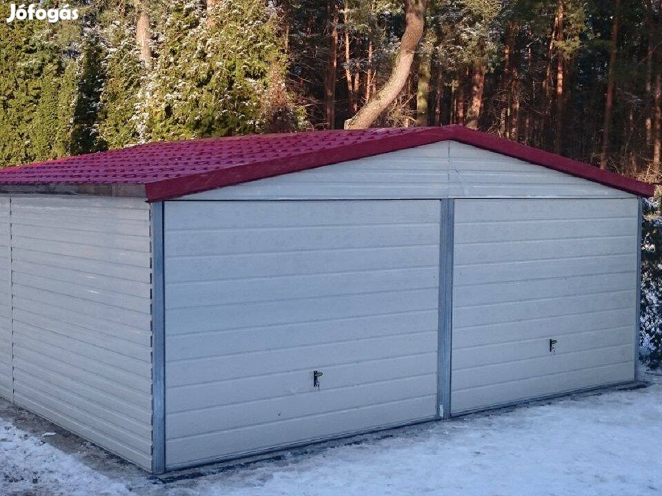 szegélyekkel, vízszintes esőcsatornával és cserepeslemezzel a tetőn. A frontos 2 db billenőkapuval 20 cm horganyzott, fehér, vízszintes bordázattal, horganyzott 30 mm zártszelvény szerkezettel.