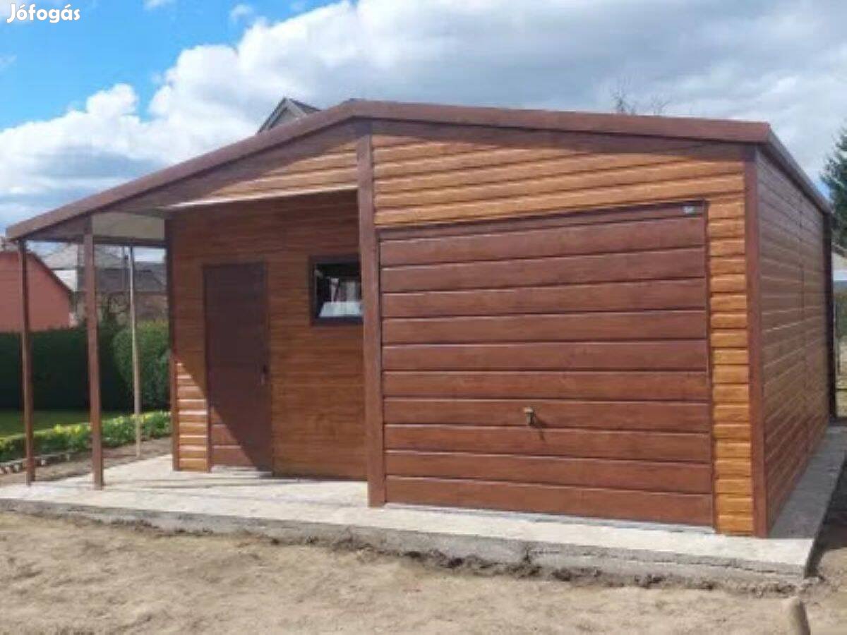 Két oldalra lejtő tető, billenő kapuval, vízszintes bordázat, szegélyekkel, vízszintes csatornával, Bordázott, horganyzott, acéllemez, akril védelemmel, s mogyoró- v mogyoró színekben.. A fronton jobbra 1 db billenő garázskapu, balra 2 x 1 m beugrás, nyitott fülke, bukóablak és személybejáró. Bal oldalon 2 műanyag bukó ablak, Az épület bal oldalán 1 m széles oldaltető, horganyzott 30 mm zártszelvény keretszerkezettel.