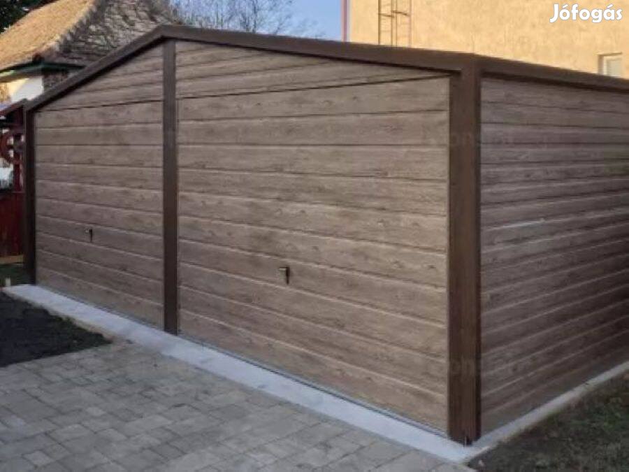 Mobilgarázs, tároló 6 x 6 m, 71m, Prémium, ingyenes szállítás, szerelés országosan, Két oldalra lejtő tető, billenő kapukkal, vízszintes bordázat, szegélyekkel, csatornával, Bordázott, horganyzott, acéllemez, akril védelemmel, fautánzatú, winchester tölgy színekben. A belülről filces tető. A fronton 2 db billenő garázskapu, 1 műanyag bukó ablak a jobb oldalon, esőcsatorna és lefolyócső, horganyzott 30 mm zártszelvény keretszerkezettel.