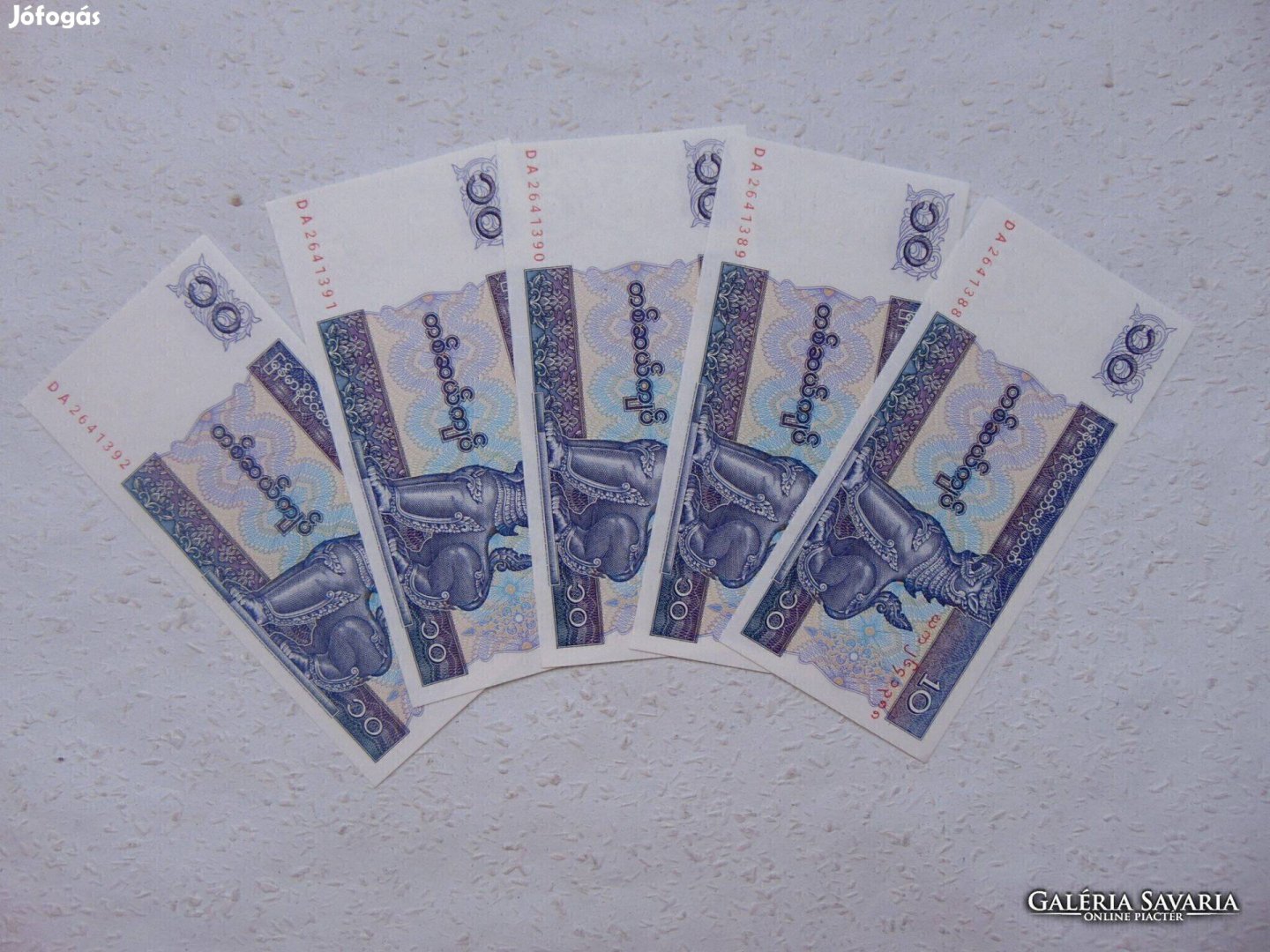 Myanmar 10 kyats 5 darab sorszámkövető szép bankjegy
