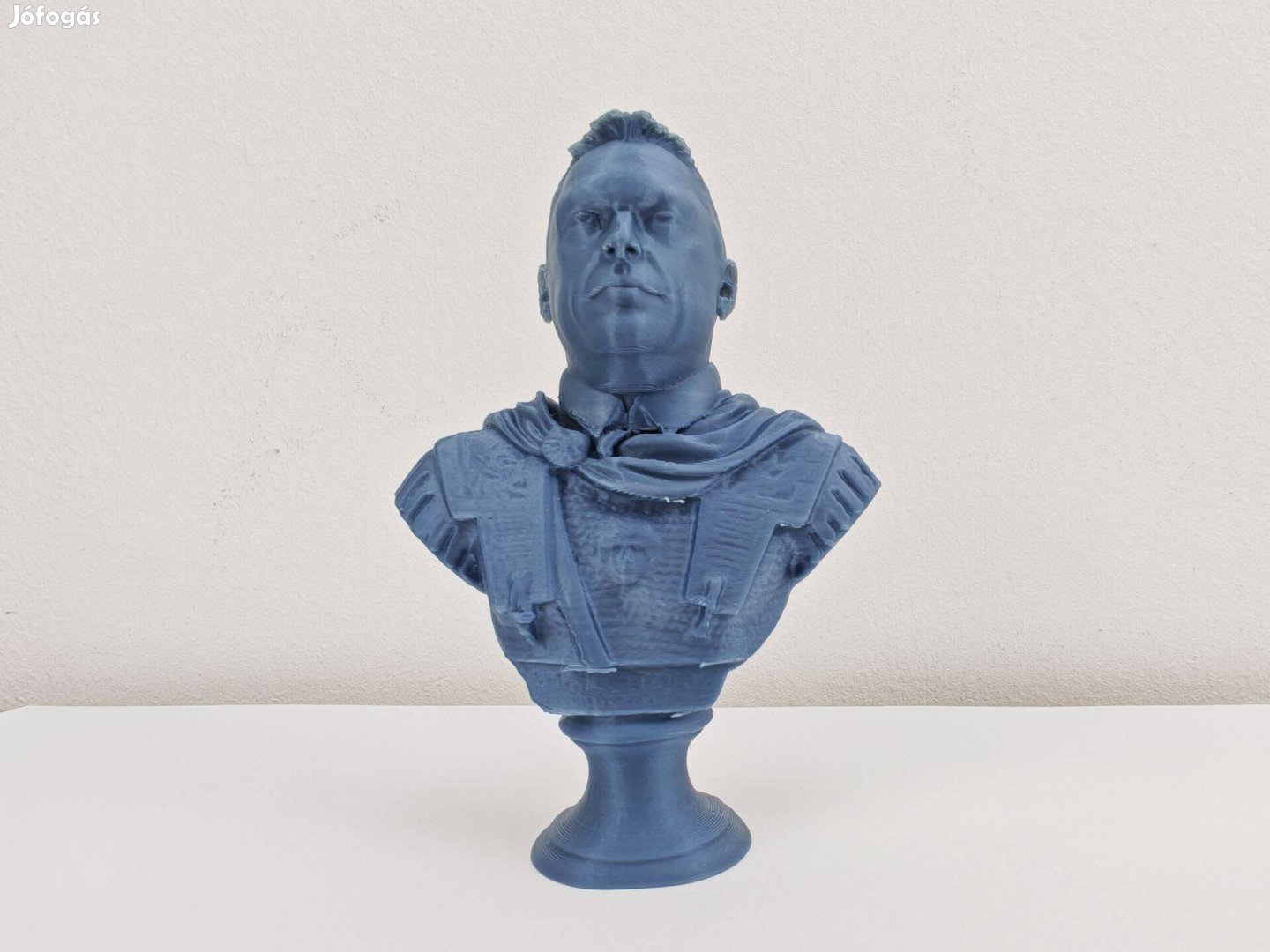 Eladó egy különleges, mélykék árnyalatú, 3D nyomtatási technológiával készült mellszobor. A több mint 9 cm magas alkotás a klasszikus római hadvezérek tekintélyét ötvözi a modern, rétegzett textúrával.