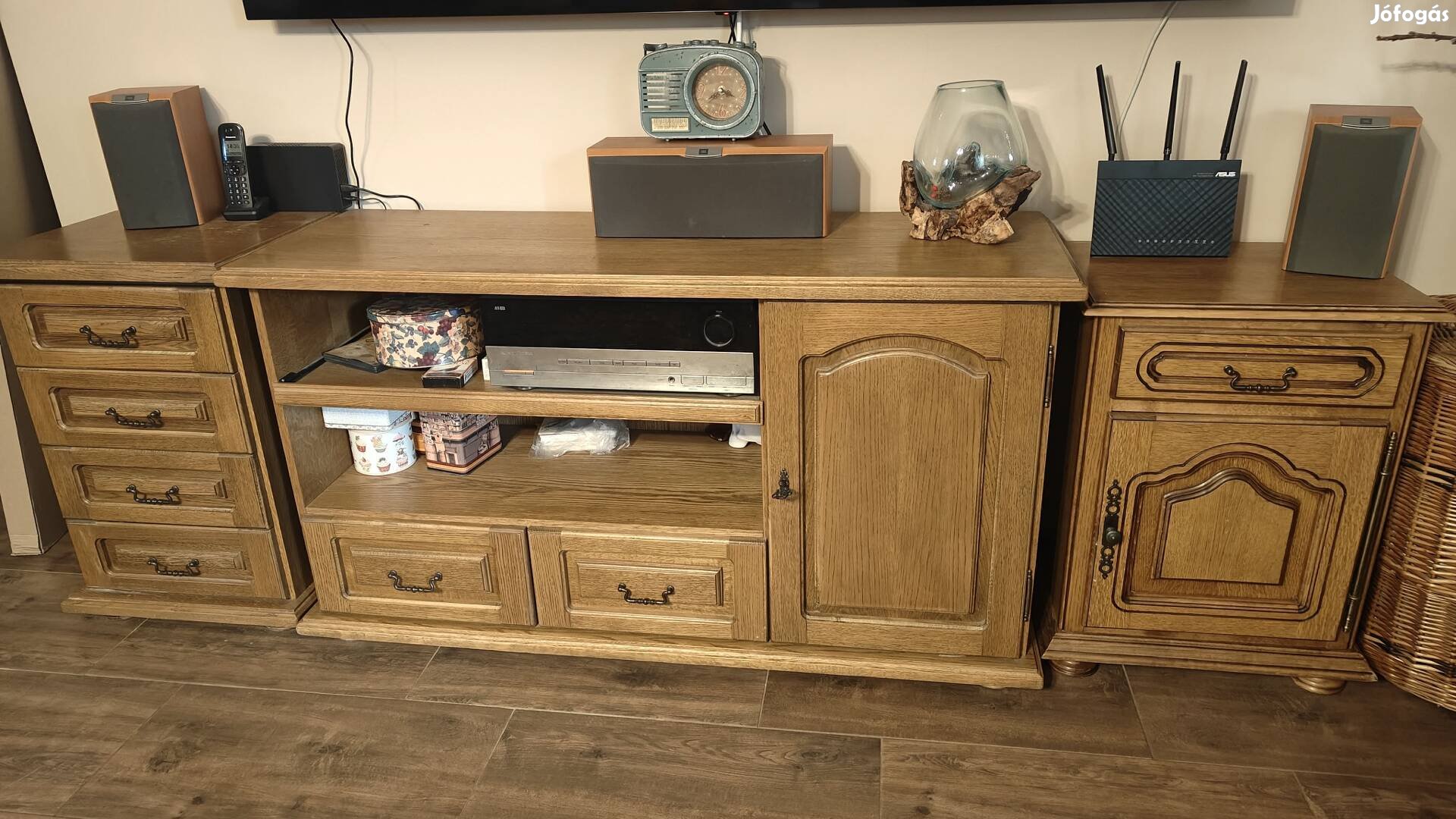 Tömör tölgyfa tv szekrény, fiókos, ajtós kis szekrény. Egyben használtuk, úgy is szeretnénk eladni. Ebből még nem sajnálták ki az anyagot, masszív! Szállitásban nem tudunk segíteni, de kocsiig természetesen igen! Méretei: Kis fiókos: szé: 49cm, ma: 73,5cm, mé: 44cm. Kis fiókos, ajtós: szé: 50cm, ma: 68cm, mé: 40cm. Tv szerény: szé: 133cm, ma: 73,5cm, mé: 44cm.