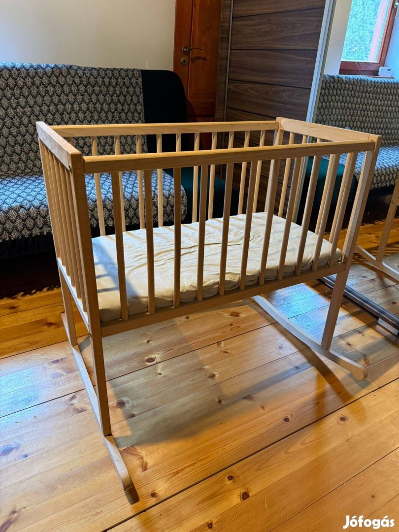 A bele való matraccal együtt. 80x45x84 magas. Talán ha kétszer volt benne a gyerkőc. Jó minőségű bükkfa. Posta ok .