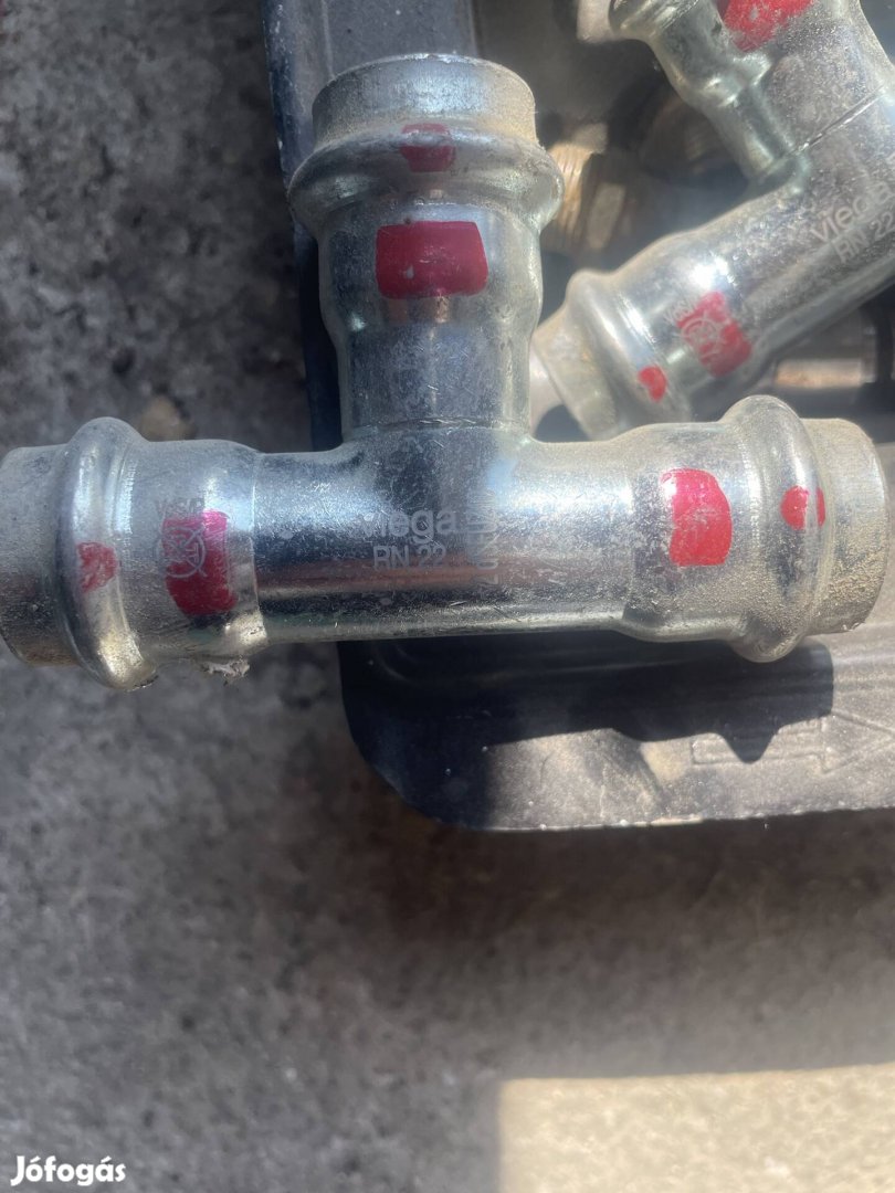 Eladó a képeken látható, nagyobb mennyiségű eredeti Viega Prestabo press idom csomag. A készlet vegyesen tartalmaz T-idomokat és 90 fokos íveket (könyököket) is.