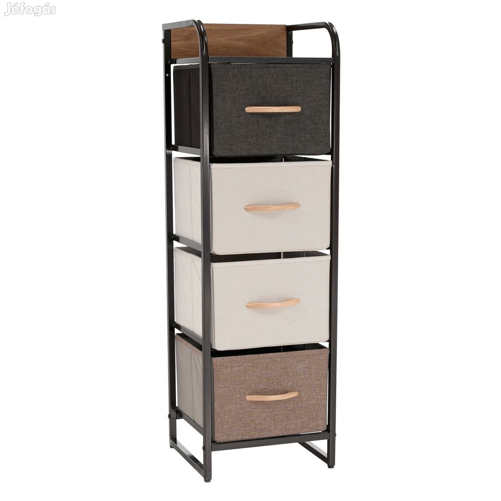 A konstrukció sötétbarna fémből készült. A fiókok szövetének színe bézs, világosbarna és sötétbarna. Tökéletesen kiegészítik a fa fogantyúk. A felső lemez MDF-ből készült, ezért ne féljen kiállítani rajta az ajándéktárgyakat, családi fotókat vagy más értékeit.