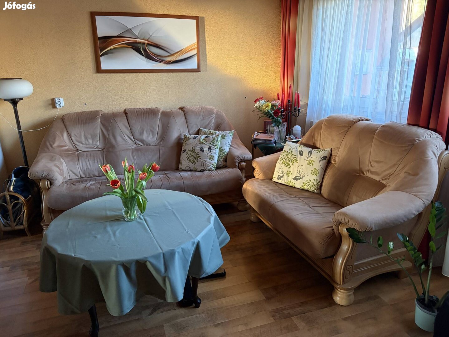 Alcantara ( hasitott bor) 3 és 2 személyes ülogarnitúra eladó. Camel ( tejeskávé) színu. Faragott fakeretes, a szivacsok kivehetoek és cipzárosak. Sérülésmentes, a kiülve nincsenek. Háziállat nincs. A kanapé tisztitható. Jelenlegi állapotban normális, de egy tisztitással ujjá lehetne varázsolni.