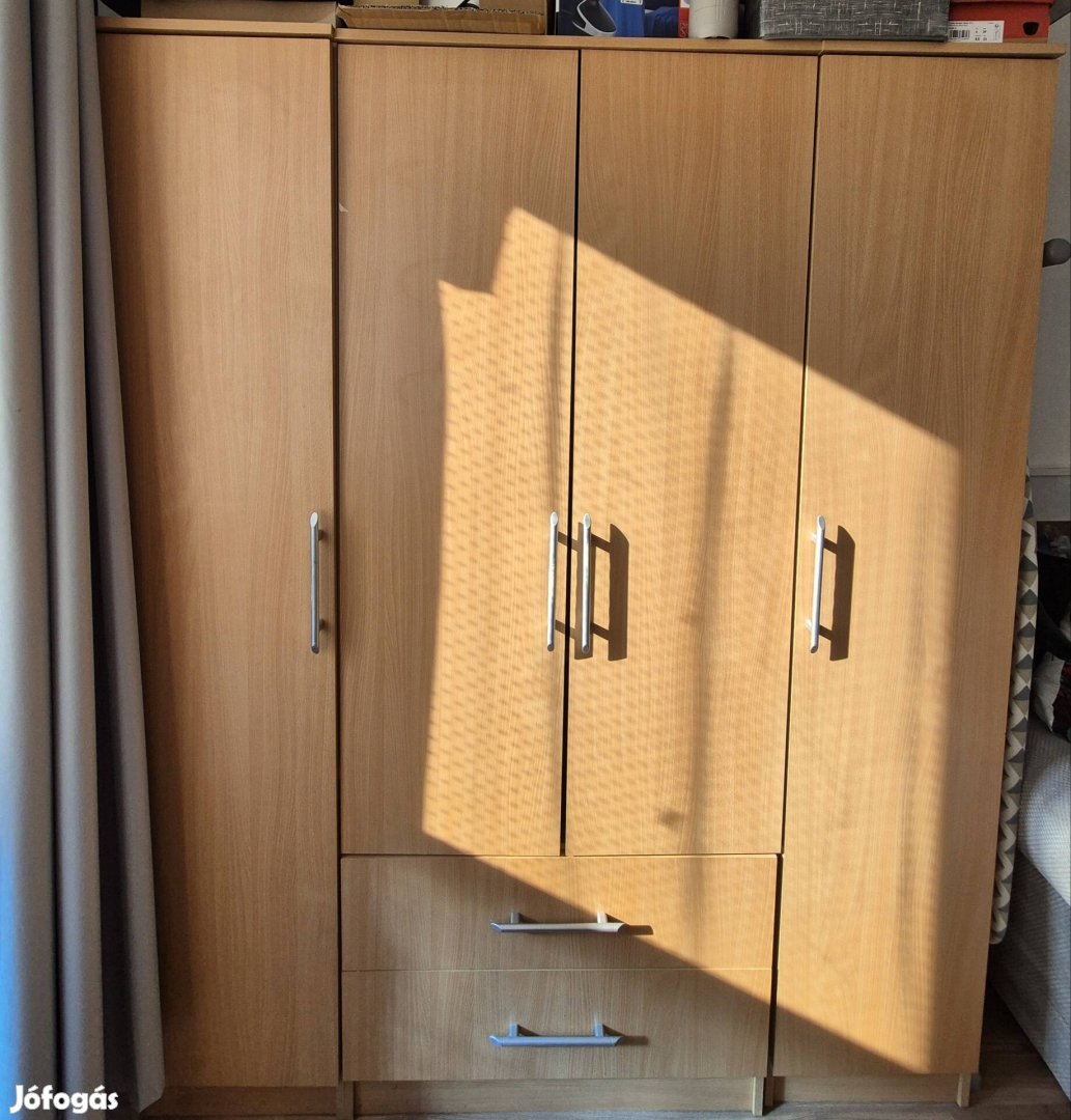 Eladó a képeken látható 3 részes használt, de jó állapotú szekrénysor. Részei: a két szélső elem akasztós, egy felső pakolós résszel, középen pakolós rész, 4 polccal, alul 2 fiók.