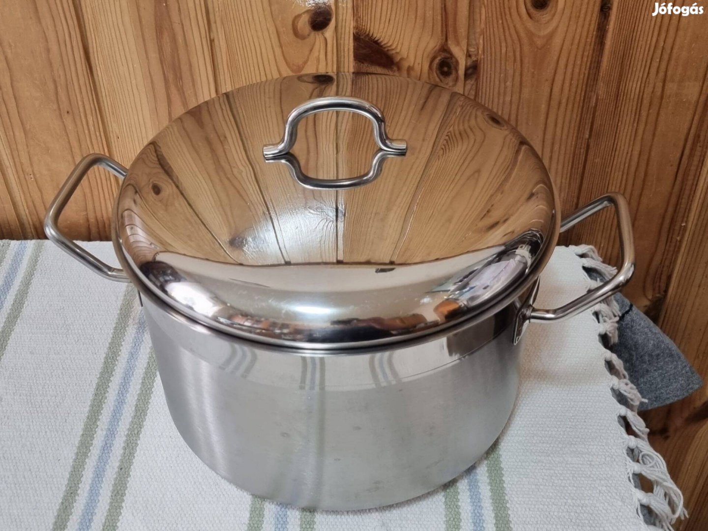 Eladó képeken látható, 24 centiméter belső átmérőjű, 6.5 literes fazék, fedővel. Az edény indukciós főzőlapon is használható.