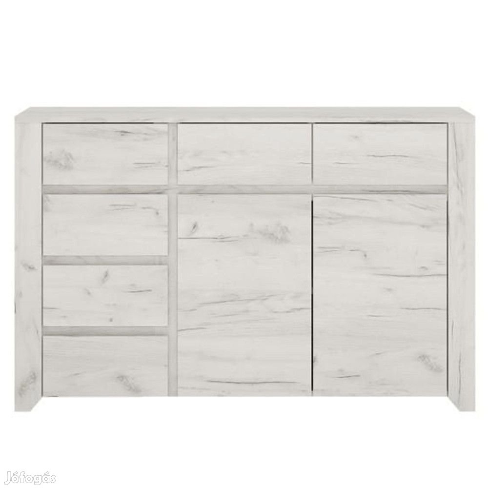 Ez a komód ügyesen el van osztva két részre. A komód bal oldalán talál négy kisebb fiókot, a jobb oldalon egy szekrényt ajtóval, benne egy polccal. A szekrény felett két kis fiók van.