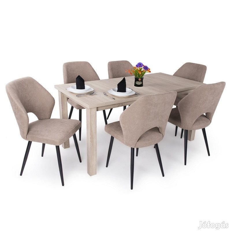 Ez az étkezőgarnitúra tartalmaz egy modern megjelenésű, laminált MDF asztallapos, bővíthető étkezőasztalt, amely pácolt, lakkozott tömörfa lábakon áll. Továbbá tartalmaz 6 db porfestett fekete fém lábból, és világosbarna szövet kárpitból álló favázas étkezőszéket.