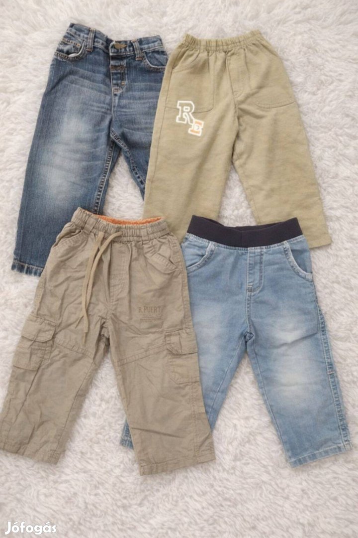 4 db kényelmes és stílusos nadrág 86-os méretben, kb. 1824 hónapos kisfiúnak. Mindegyik jó állapotú, kényelmes viselet ovis hétköznapokra vagy játszótérre. Hosszúságuk 4650 cm között.