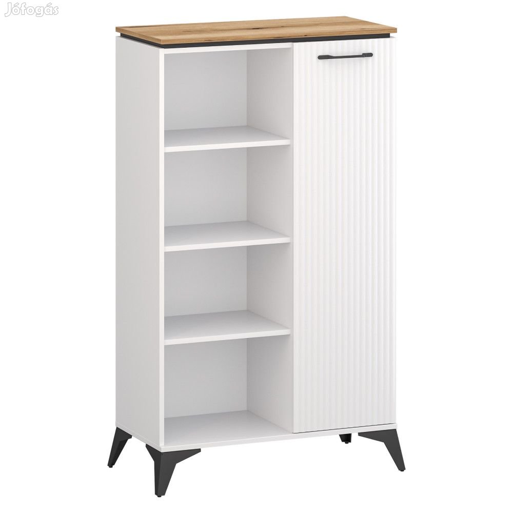 Anyag: laminált DTD/fóliázott MDF/PVCSzín: fehér/evoke tölgyMéretek (SzxMéxMa): 85,5x43,5x141,8 cmAnyag vastagsága: 1,6 cmEgyajtósNyitott tárhelyPolcosPolc teherbírása: 3 kgFelső lap teherbírása: 30 kgFém fogantyúkFogantyúk színe: feketeFém lábakLábak színe: feketeLábak magassága: 14,5 cmDekoratív bordázott ajtókModern dizájnJavasoljuk a falhoz rögzíteniÖsszeszerelve szállítva További információkért kattintson ide: