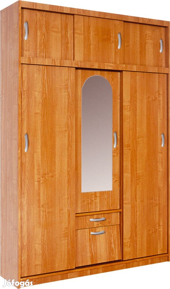 3-ajtós, akasztós, polcos, fiókos gardróbszekrény tolóajtóval, magasítóval és tükörrel, éger színben. További információkért kattintson ide: