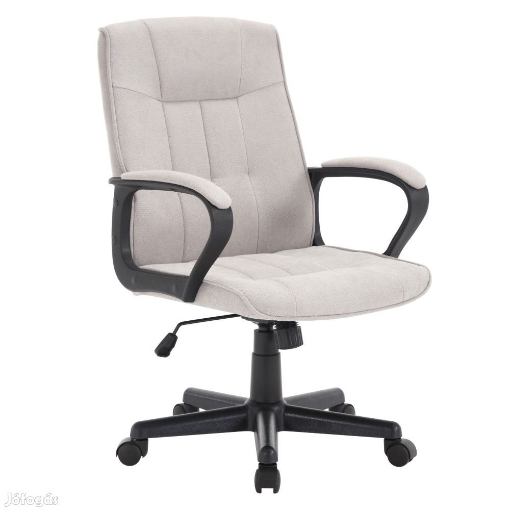 A világosszürke szövet kárpit stílusos megjelenést kölcsönöz, míg a stabil fekete műanyag lábazat, amely kerekekkel van ellátva, biztosítja a szék megfelelő stabilitását és szilárdságát.
