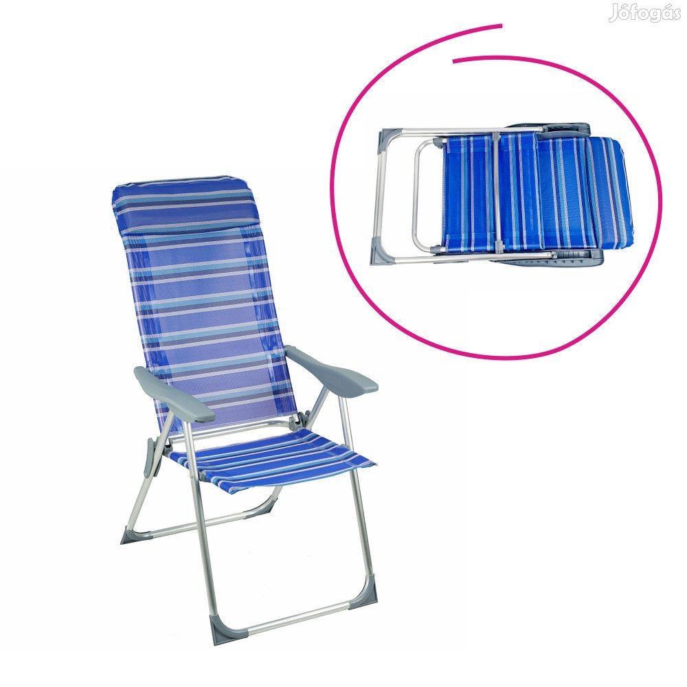 Anyag: alumínium/műanyag/poliészter Szín: kék/szürke Méretek (SzxMéxMa): 58x69/103x82/109 cm Összecsukott szék méretei (SzxMéxMa): 99x58x8 cm Ülés magassága: 42 cm Ülés mélysége: 36 cm Ülés szélessége: 45 cm Háttámla szélessége: 44 cm Háttámla magassága: 77 cm Kartámasz magassága: 61 cm Teherbírás: 90 kg Súly: 3,75 kg Állítható 5 pozíció Műanyag kartámlák Műanyag védőkupakok az alsó szerkezeten Alkalmas kertbe, teraszra, medencébe Könnyű kezelhetőség és mozgatás Összeszerelve szállítva További információkért kattintson ide: