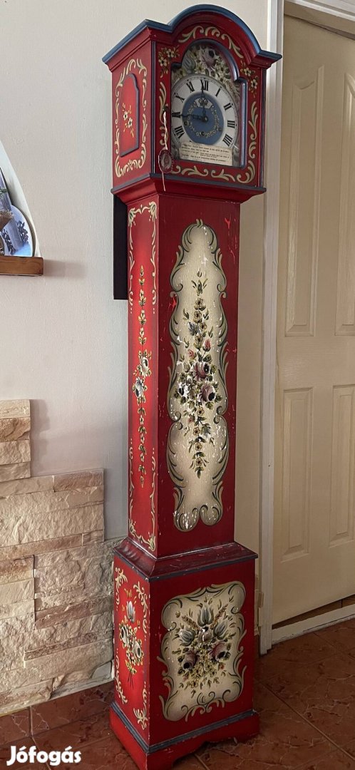 Eladó a képeken látható Walt Clocks gyártmányú festett álló óra. 20. szazad közepén készült mechanikus , hibátlan működéssel , fél és egész óránál is ad hangot. Minimális festék lepattogások adódnak rajta korából fakadóan de összességében szép állapotú , egyben lévő darab. Eredeti garancia papírja és kulcs is megvan. Helyileg Veszprém.
