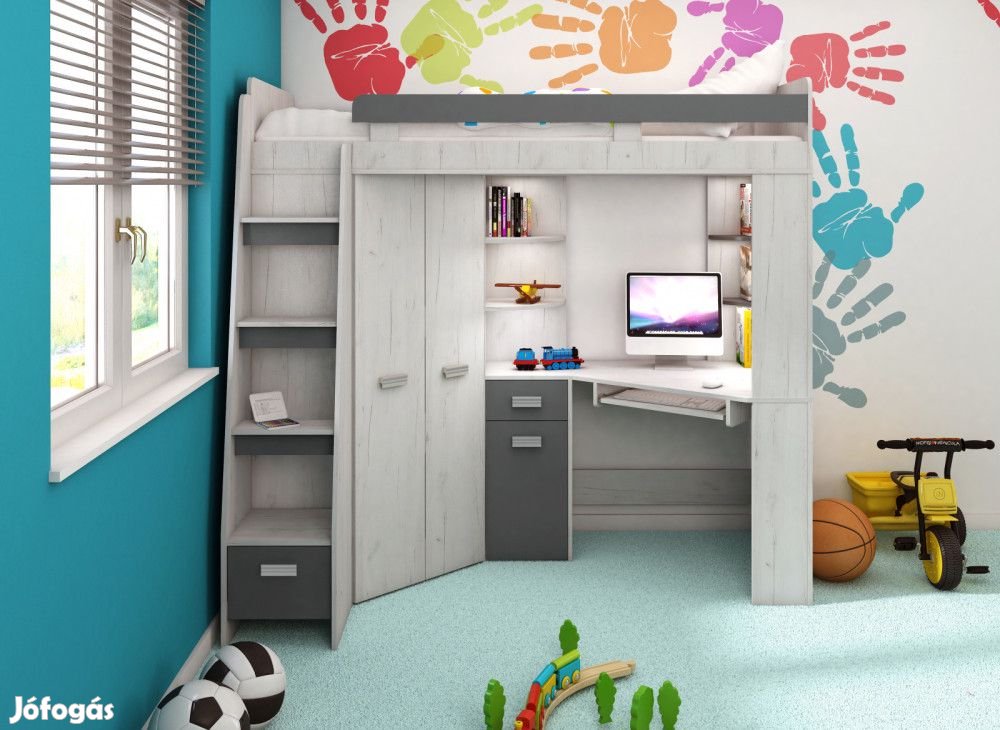 Balos galériaágy lépcsővel, korláttal, szekrényekkel, íróasztallal, billentyűzettartóval, polcokkal és fiókokkal, matrac nélkül, fehér tölgy és szürke színben. További információkért kattintson ide: