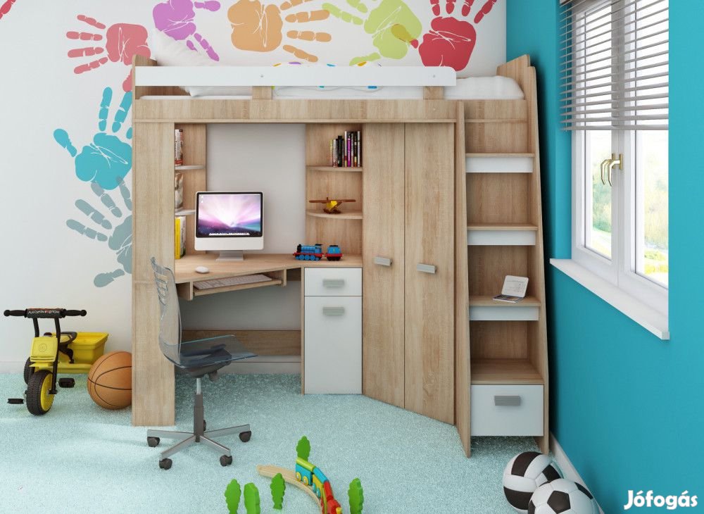 Jobbos galériaágy lépcsővel, korláttal, szekrényekkel, íróasztallal, billentyűzettartóval, polcokkal és fiókokkal, matrac nélkül, világos sonoma tölgy és fehér színben. További információkért kattintson ide: