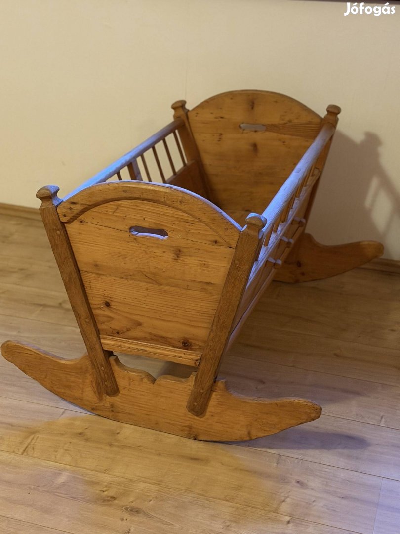 Eladó egy klasszikus, tömör fából készült baba bölcső, amely ringató talppal rendelkezik, így finom, nyugtató mozgást biztosít a kisbabának.