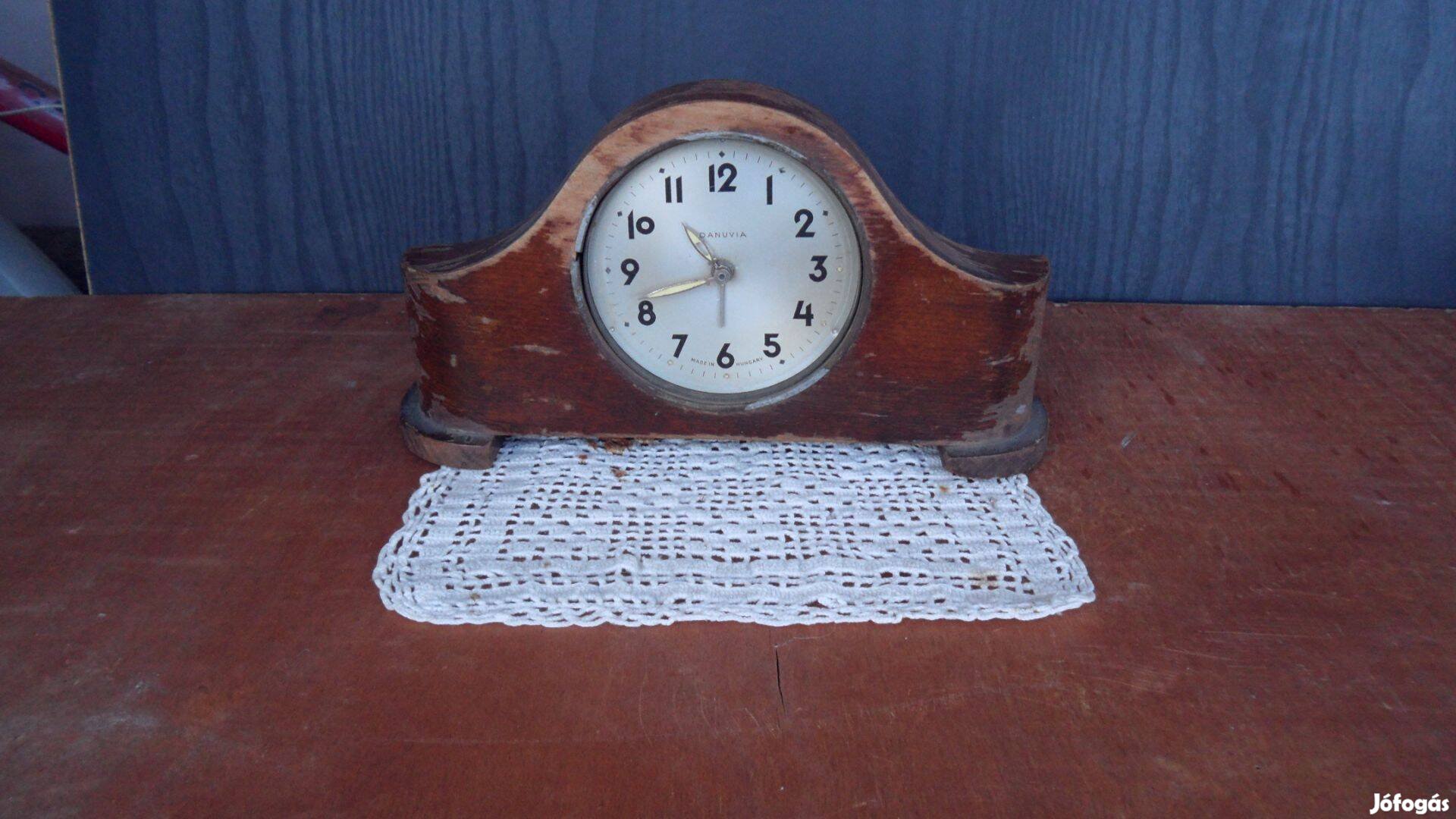 Antik Danuvia ébresztő óra, faváz hibátlan asztali polc, kandalló 1949