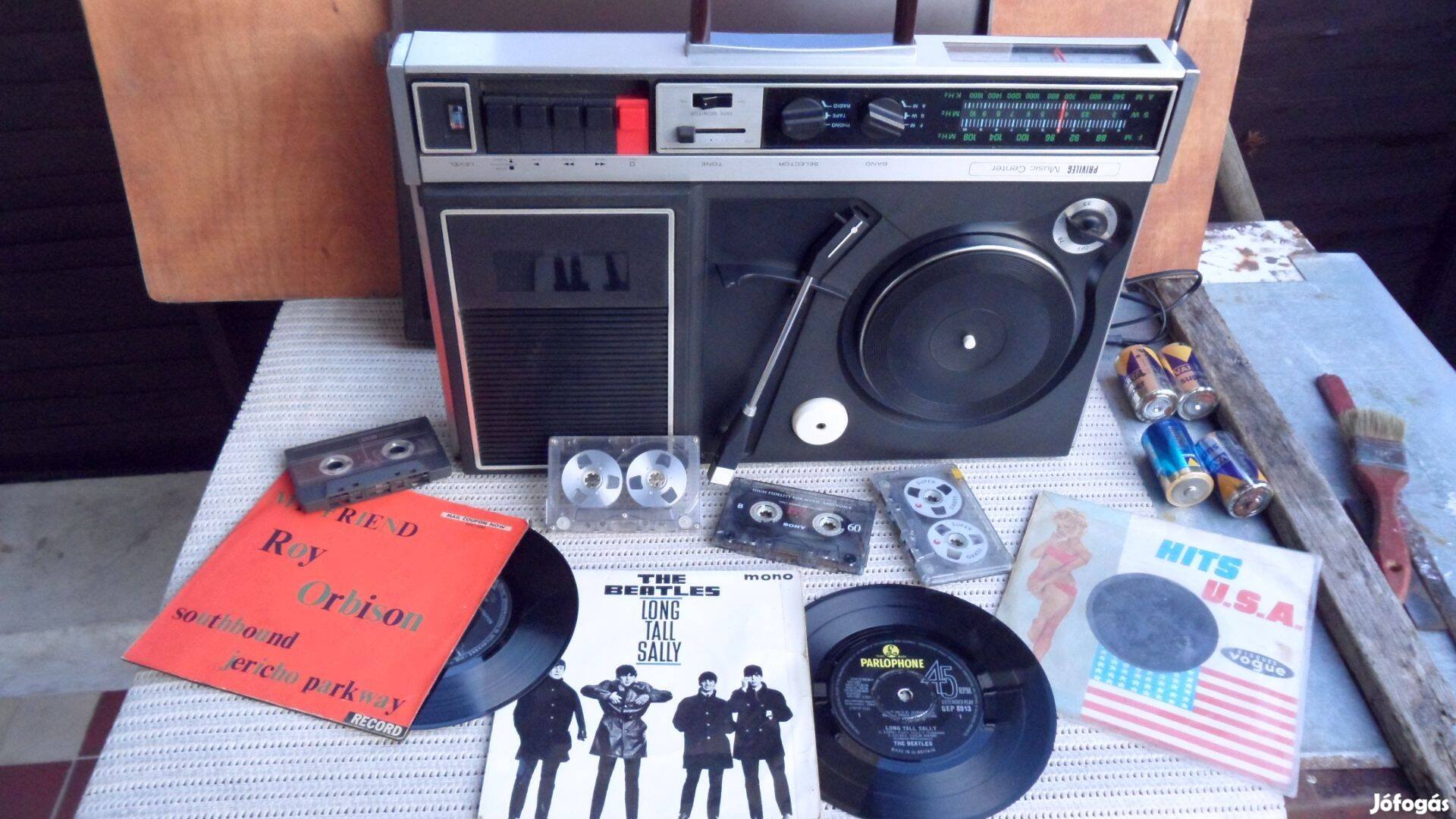 LP 33/45 /78 as automata bakelit lemezjátszó, (külön rock bakelitok is) felvevős kazettás deck, erősítő, (mikrofon) és 3 sávos világvevő rádió . FM 88 10, 8 MHz, SW 3