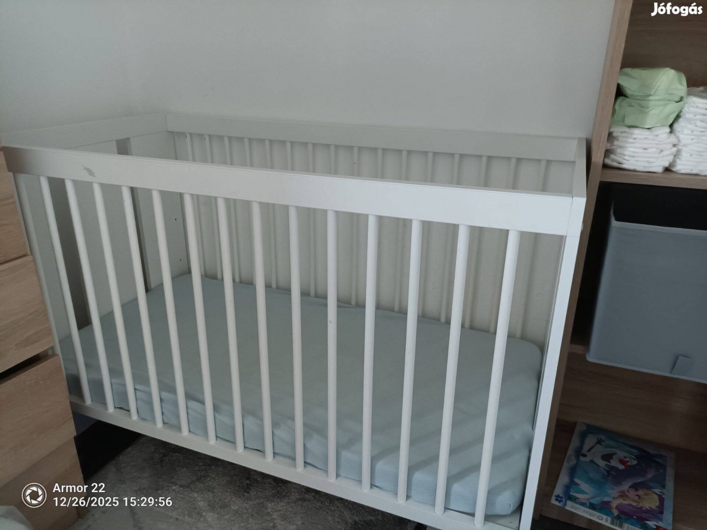 Lapra szerelt állapotban, matraccal 60x120cm, 3 magasságban állítható