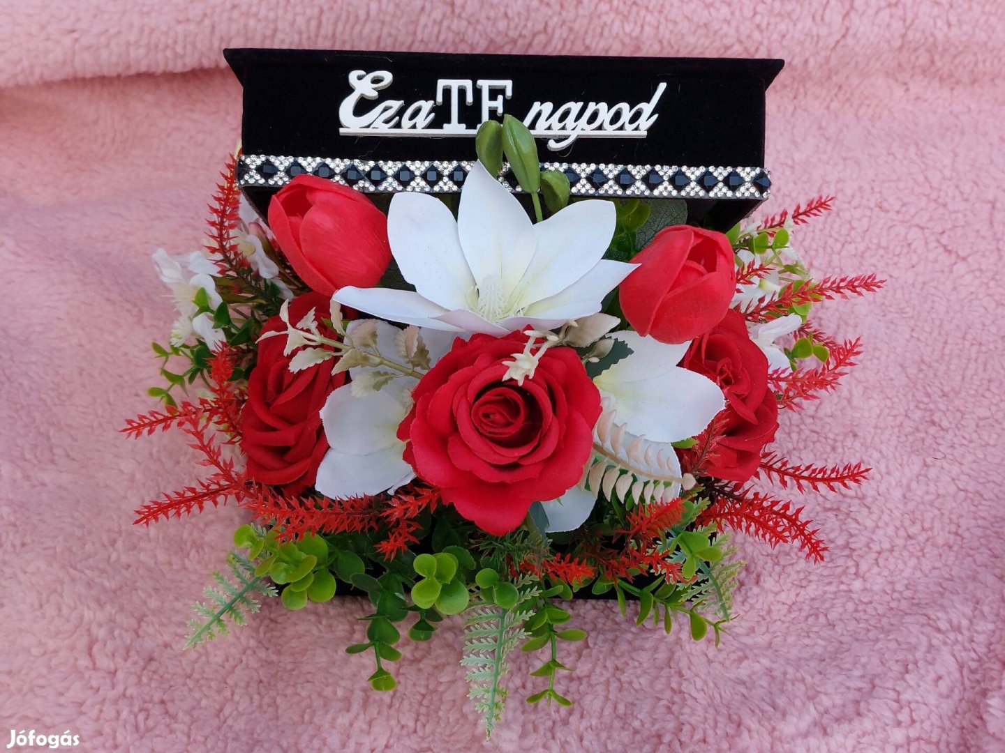 Ballagó doboz. Piros/Fehér virágokkal. Strassz szalaggal
