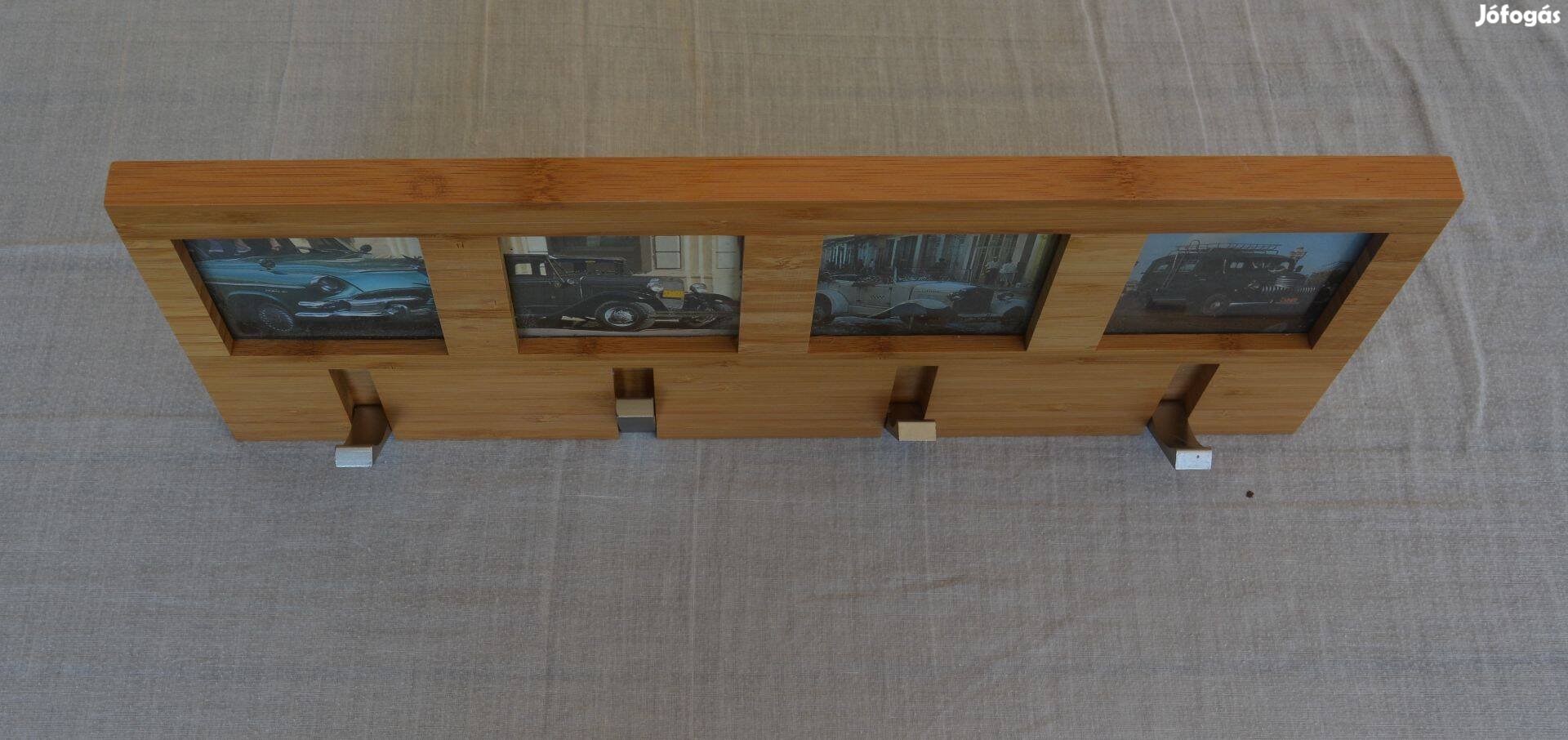 Eladó a képeken látható bambusz fénykép tartó 4 db 9x9cm fénykép hellyel, kombinálva 4 db rozsdamentes kihajtható akasztókkal.