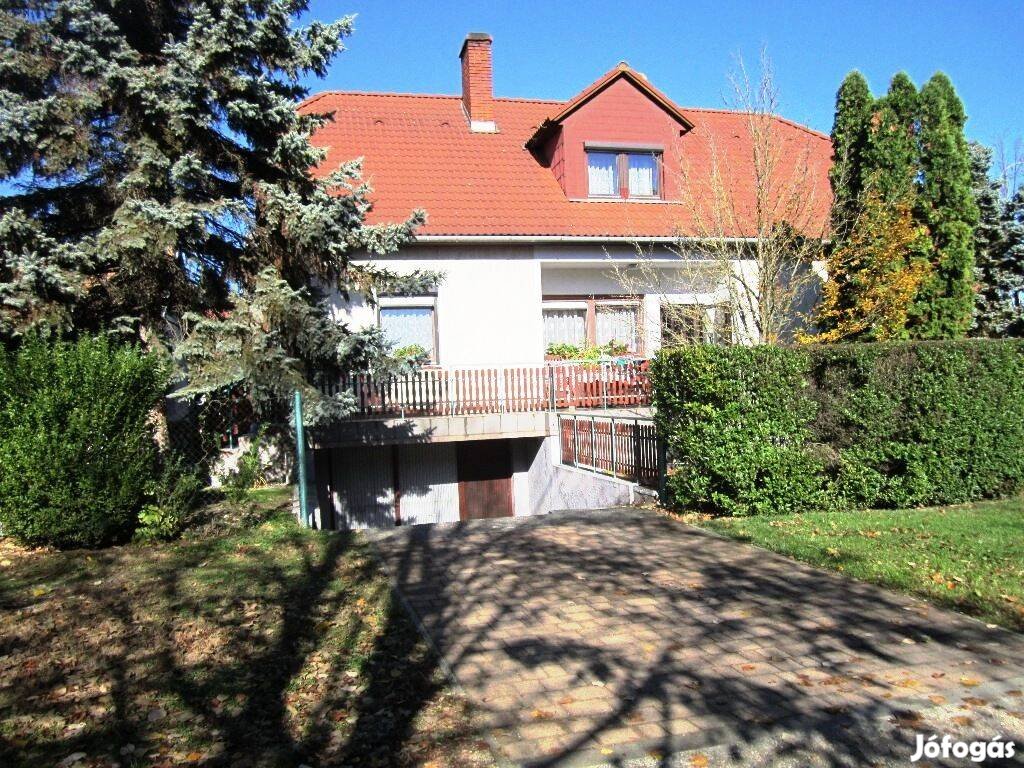 Egy 907 m2-es összközműves telken találjuk ezt az 1989-ben épült, 10 éve felújított, kitűnő elrendezésű családi házat. A két szinten összesen 160 m2-es hasznos alapterületű épület földszintjén 3 szoba, konyha-étkező, fürdőszoba, külön wc található. Az emeletre egy kényelmes belső lépcsőn juthatunk fel, ahol 2 hálószoba, fürdő és egy kis nappali lett kialakítva. Egy 42 m2-es melléképületben duplagarázst találunk, valamint a ház alatt egy 70 m2-es pincét. Tíz éve modern műanyag nyílászárók redőnnyel lettek beépítve, a burkolatok, ill. az emeleti fürdőszoba is akkor lett felújítva. Továbbá új gépesített konyhabútor is akkor lett beépítve. Az épület fűtésrendszere is 10 éve lett korszerűsítve, új gázkazán és lapradiátorok kerültek az épületbe. A gázfűtés mellett egy vegyes tüzelésű kazán is üzemel, amit 2025 nyarán építettek be. Az épület elektromos hálózata 3 fázisú, 3 x 16 A. Az ingatlant csendes, nyugodt kertvárosi övezetben találjuk, a házat szépen gondozott és parkosított díszkert veszi körbe, tökéletes lehetőséget nyújt a kikapcsolódásra. Bevásárlási lehetőségek, iskola, óvoda, buszmegálló 10 perces sétával megközelíthetők. (Irodánk az ingatlan vásárlással összefüggő teljes körű ügyvédi, ill. bankhitel ügyintézését is vállalja.)