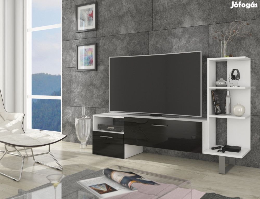 TV-állvány lenyíló ajtókkal és polcokkal, fehér és fényes fekete színben. További információkért kattintson ide:
