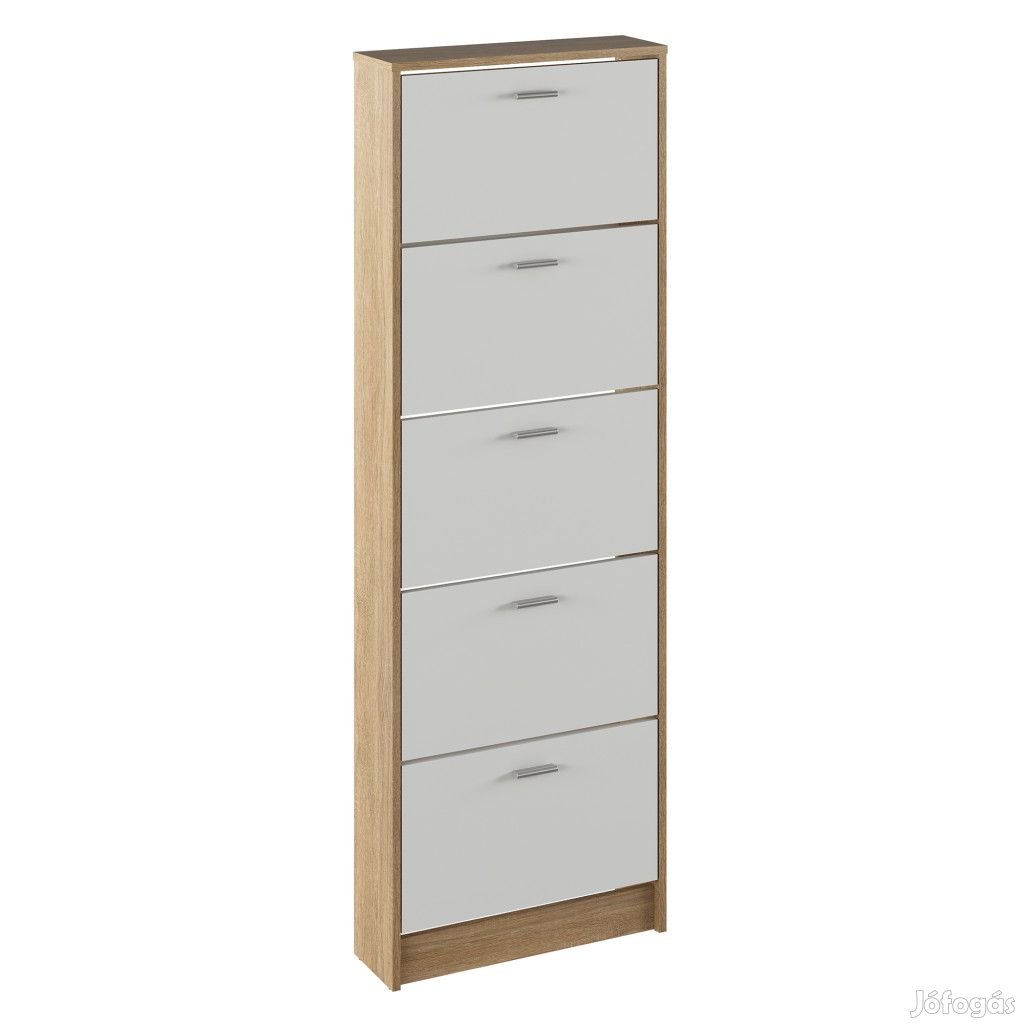 A cipősszekrény laminált DTD-ből készül, sonoma tölgy és fehér színváltozatban. Elegendő tárhellyel rendelkezik öt billenős fiók formájában.