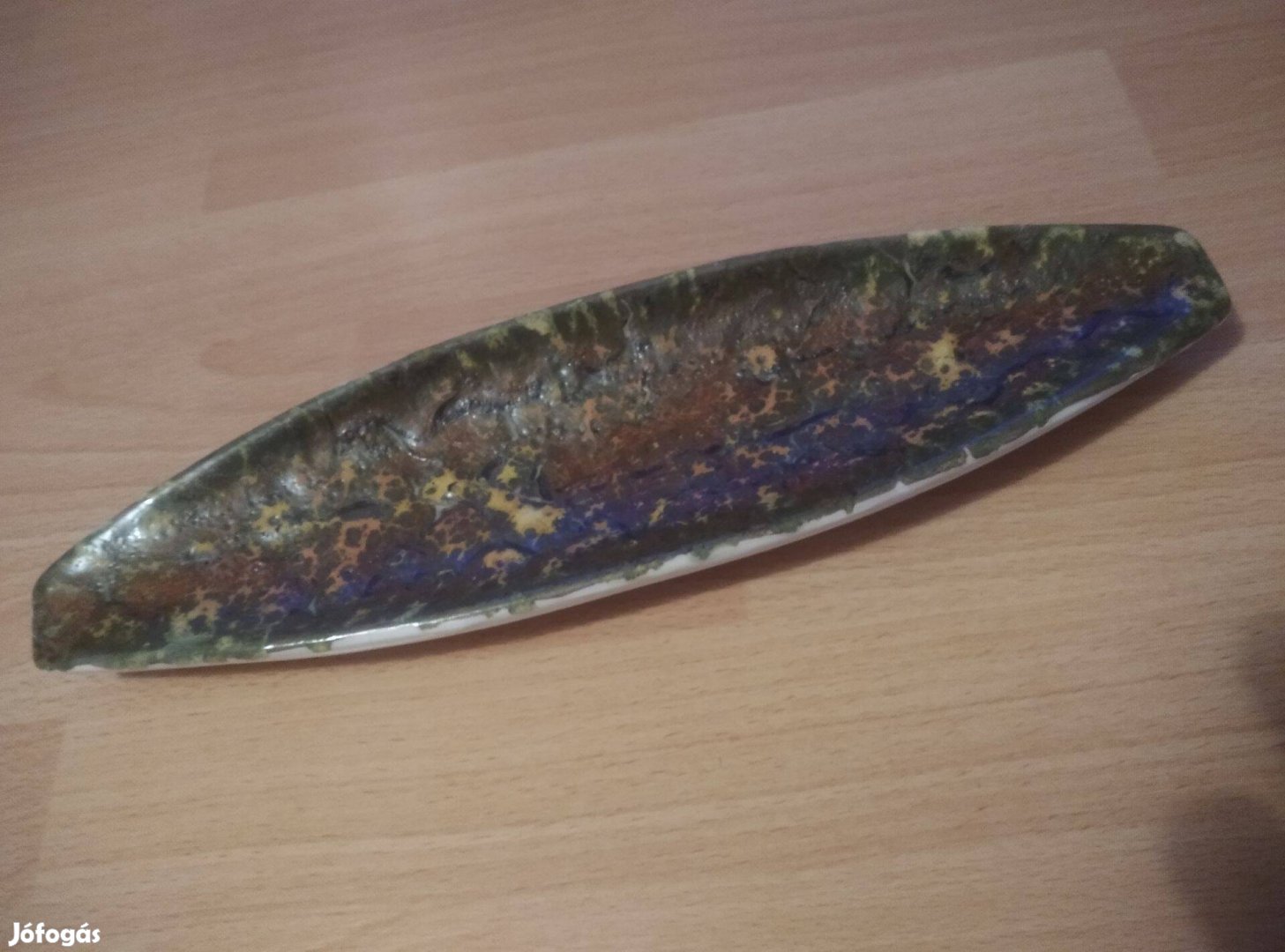 Eladó egy bodrogkeresztúri kerámia tál vagy falidísz, amelyet jellegzetes csónakformája és mázas felülete miatt ismernek.